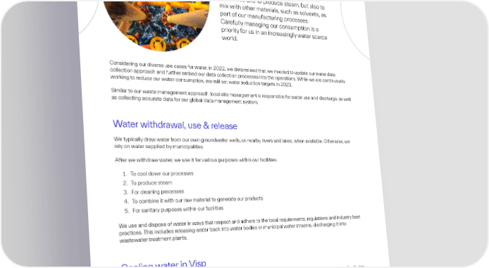 Water management An essential resource for our operations, water is used in a variety of ways across our facilities: we use water not only to cool our processes and to produce steam, but also to mix with other materials, such as solvents, as part of our manufacturing processes. Carefully managing our consumption is a priority for us in an increasingly water scarce world. Considering our diverse use cases for water, in 2022, we determined that we needed to update our water data collection approach and further embed our data collection processes into the operations. While we are continuously working to reduce our water consumption, we will set water reduction targets in 2023. Similar to our waste management approach, local site management is responsible for water use and discharge, as well as collecting accurate data for our global data management system. Water withdrawal, use & release We typically draw water from our own groundwater wells, or nearby rivers and lakes, when available. Otherwise, we rely on water supplied by municipalities. Aer we withdraw water, we use it for various purposes within our facilities: . To cool down our processes . To produce steam . For cleaning processes . To combine it with our raw material to generate our products . For sanitary purposes within our facilities We use and dispose of water in ways that respect and adhere to the local requirements, regulations and industry best practices. This includes releasing water back into water bodies or municipal water streams, discharging it into wastewater treatment plants. Cooling water in Visp Visp in Switzerland, our largest production site, is located near the river Rhône. Due to its close proximity to the Swiss Alps, the river is naturally cold, holding a temperature between approximately 4°C–8°C year-round. This natural source of cooling water allows us to operate our facilities in Visp without energy-intensive cooling towers. To ensure we are respecting and optimizing the use of this natural resource, we are currently conducting an analysis to determine our use eciency. Aer identifying potential areas for optimization, we seek to actively lessen use by implementing a closed-meshed monitoring concept. With deeper understanding, we will start developing strategies to maximize reduced consumption.