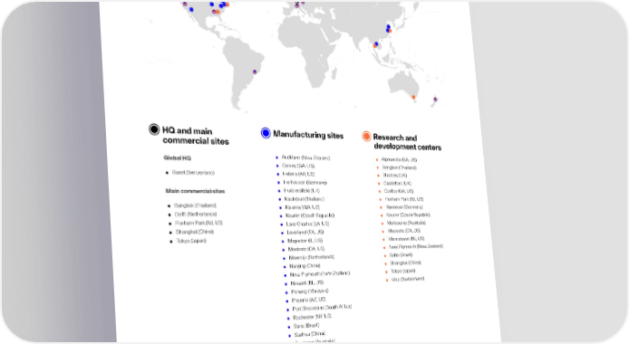 Operating locations HQ and main Manufacturing sites Research and commercial sites development centers Auckland (New Zealand) Alpharea (GA, US) Global HQ Conley (GA, US) Bangkok (Thailand) Basel (Switzerland) Helena (AR, US) Blackley (UK) Horhausen (Germany) Castleford (UK) Huddersfield (UK) Conley (GA, US) Main commercial sites Kabinburi (Thailand) Florham Park (NJ, US) Bangkok (Thailand) Kalama (WA, US) Hannover (Germany) Del (Netherlands) Kourim (Czech Republic) Kourim (Czech Republic) Florham Park (NJ, US) Lake Charles (LA, US) Melbourne (Australia) Shanghai (China) Levelland (TX, US) Modesto (CA, US) Tokyo (Japan) Mapleton (IL, US) Morristown (NJ, US) Modesto (CA, US) New Plymouth (New Zealand) Moerdijk (Netherlands) Salto (Brazil) Nanjing (China) Shanghai (China) New Plymouth (New Zealand) Tokyo (Japan) Newark (NJ, US) Visp (Switzerland) Penang (Malaysia) Phoenix (AZ, US) Port Shepstone (South Africa) Rochester (NY, US) Salto (Brazil) Suzhou (China) Trentham (Australia) Valparaiso (IN, US) Williamsport (PA, US) Visp (Switzerland)