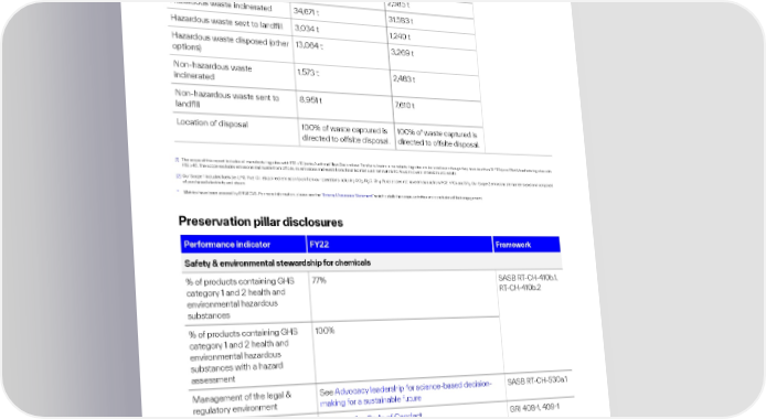 Performance indicator FY21 FY22 Framework Total waste generated* 70,717 t 53,881 t Hazardous waste generated 57,670 t 41,203 t Non-hazardous waste generated 13,047 t 12,678 t Hazardous waste recycled 6,899 t 5,109 t Non-hazardous waste recycled 2,522 t 2,585 t Hazardous waste incinerated 34,671 t 31,583 t Hazardous waste sent to landfill 3,034 t 1,240 t Hazardous waste disposed (other 13,064 t 3,269 t options) Non-hazardous waste 1,573 t 2,483 t incinerated Non-hazardous waste sent to 8,951 t 7,610 t landfill Location of disposal 100% of waste captured is 100% of waste captured is directed to osite disposal. directed to osite disposal. [1] The scope of this report includes all manufacturing sites with FTE >10 (note, Auckland New Zealand and Trentham Australia manufacturing sites are included even though they have less than 10 FTEs) and Pilot Manufacturing sites with FTE >45. The scope excludes emissions and waste from oces, as emissions and waste from these locations are not material to Arxada’s overall emissions and waste. [2] Our Scope 1 includes fuels (i.e. LPG, Fuel Oil, etc.) direct emission to air from our operations including CO , N O, CH . Arxada does not have emissions from PCF, HFCs and SF . Our Scope 2 emissions are market-based and composed 2 2 4 6 of purchased electricity and steam. * Metrics have been assured by ERM CVS. For more information, please see the “External Assurance Statement” which details the scope, activities and conclusion of their engagement. Preservation pillar disclosures Performance indicator FY22 Framework Safety & environmental stewardship for chemicals % of products containing GHS 77% SASB RT-CH-410b.1, category 1 and 2 health and RT-CH-410b.2 environmental hazardous substances % of products containing GHS 100% category 1 and 2 health and environmental hazardous substances with a hazard assessment Management of the legal & See Advocacy leadership for science-based decision- SASB RT-CH-530a.1 regulatory environment making for a sustainable future Child labor and forced or See Supplier Code of Conduct GRI 4081, 4091 compulsory labour