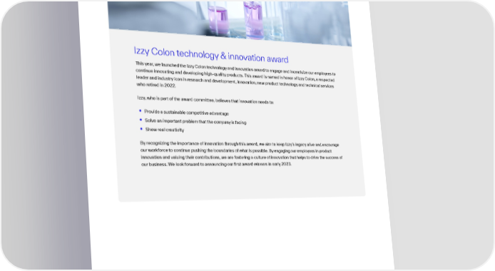HIGHLIGHT Izzy Colon technology & innovation award This year, we launched the Izzy Colon technology and innovation award to engage and incentivize our employees to continue innovating and developing high-quality products. This award is named in honor of Izzy Colon, a respected leader and industry icon in research and development, innovation, new product technology and technical services who retired in 2022. Izzy, who is part of the award commiee, believes that innovation needs to: Provide a sustainable competitive advantage Solve an important problem that the company is facing Show real creativity By recognizing the importance of innovation through this award, we aim to keep Izzy’s legacy alive and encourage our workforce to continue pushing the boundaries of what is possible. By engaging our employees in product innovation and valuing their contributions, we are fostering a culture of innovation that helps to drive the success of our business. We look forward to announcing our first award winners in early 2023.