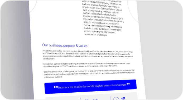 Our business & sustainability Arxada is a global specialty chemicals company, headquartered in Switzerland that was created in 2021 following the carve-out and sale of Lonza Specialty Ingredients to private equity firms Bain Capital and Cinven. With a long-standing history as a global leader in specialty chemicals, Arxada develops and manufactures a broad range of innovative products that address the growing need for more sustainable protection of human health and wellbeing, infrastructure and our planet. By doing so, the company aims to solve the world’s toughest preservation challenges. Our business, purpose & values Arxada focuses on four core end-markets: Human Health and Nutrition, Home and Personal Care, Paints and Coatings and Wood Protection, and provides a broad porolio of dierentiated products and solutions. This is supported by science and innovation capabilities, in-depth regulatory know-how and a proven record in manufacturing and process development. Arxada has a global footprint spanning 26 production sites and 16 research and development centers; we have a world-leading team of 3,600 employees, serving customers across a wide range of industries. We innovate to solve, challenge and remove barriers to peak performance. We are passionate about empowering high performance and realizing potential both internally and for our partners and customers. We work together every day to achieve our purpose: Better science to solve the world’s toughest preservation challenges 3,600 26 16 Employees Production R&D centers sites