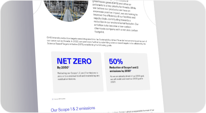 Air quality & GHG emissions To help preserve our planet and limit global warming, reducing the emissions of greenhouse gases (GHG) and other air pollutants is a key priority for Arxada. While we believe our products can have an enormous positive impact, we are looking to improve the eciency of our facilities and supply chain, contributing towards a reduction in our environmental footprint. Our ambition is to become a low-carbon chemicals company with a net zero carbon footprint. GHG intensity reduction targets were integrated into the Sustainability-Linked Financial Instruments issued as part of our carve-out as Arxada. In 2022, we went even further by submiing science-based targets to be validated by the Science Based Targets initiative (SBTi), establishing the following goals: NET ZERO 50% [1] By 2050 Reduction of Scope 1 and 2 [1] emissions by 2030 Reducing our Scope 1, 2, and 3 emissions to zero or to a residual level and neutralizing any As we are already ahead of our 2030 goal, residual emissions. we will revisit and reset our 2030 goal in 2023. [1] From our 2021 baseline. Our Scope 1 & 2 emissions In 2022, we completed a GHG inventory for our Scope 1 and 2 emissions. Scope 1, which is responsible for most of our combined Scope 1 and 2 emissions, includes emissions from fuel combustion, as well as natural gas and refrigerants used in our manufacturing processes and facilities. Scope 2 is a smaller portion of our emissions and is split between the electricity and steam used in our manufacturing processes and facilities. As we are already ahead of our 2030 goal, we will revisit and reset our 2030 goal in 2023.