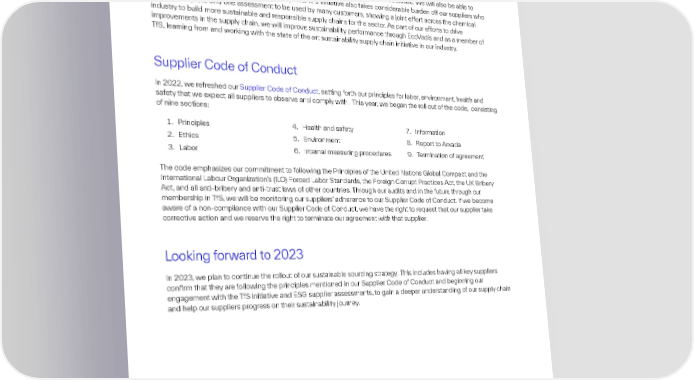 TfS assessments are conducted online and are supported by EcoVadis questionnaires. Sustainable development experts analyze all supplied data, including third-party certifications and publicly available information, to assign a supplier score from 0 to 100. This score can be broken down by scoring category to identify a supplier’s strengths and weaknesses. As a TfS member, we can request the supplier to put in place a Corrective Action Plan (CAP) to address shortcomings. The CAP includes a roadmap containing corrective actions, deadlines and responsibilities for the supplier to fulfil. To help suppliers implement the roadmap and address identified shortcomings, TfS provides suppliers with access to its academy training hub. By joining TfS, we will be able to make use of the supplier audit and assessment database. We will also be able to calculate an average score across all our suppliers. The initiative also takes considerable burden o our suppliers who need to complete only one assessment to be used by many customers, showing a joint eort across the chemical industry to build more sustainable and responsible supply chains for the sector. As part of our eorts to drive improvements in the supply chain, we will improve sustainability performance through EcoVadis and as a member of TfS, learning from and working with the state of the art sustainability supply chain initiative in our industry. Supplier Code of Conduct In 2022, we refreshed our Supplier Code of Conduct, seing forth our principles for labor, environment, health and safety that we expect all suppliers to observe and comply with. This year, we began the roll out of the code, consisting of nine sections: . Principles . Health and safety . Information . Ethics . Environment . Report to Arxada . Labor . Internal measuring procedures . Termination of agreement The code emphasizes our commitment to following the Principles of the United Nations Global Compact and the International Labour Organization’s (ILO) Forced Labor Standards, the Foreign Corrupt Practices Act, the UK Bribery Act, and all anti-bribery and anti-trust laws of other countries. Through our audits and in the future through our membership in TfS, we will be monitoring our suppliers’ adherence to our Supplier Code of Conduct. If we become aware of a non-compliance with our Supplier Code of Conduct, we have the right to request that our supplier take corrective action and we reserve the right to terminate our agreement with that supplier. Looking forward to 2023 In 2023, we plan to continue the rollout of our sustainable sourcing strategy. This includes having all key suppliers confirm that they are following the principles mentioned in our Supplier Code of Conduct and beginning our engagement with the TfS initiative and ESG supplier assessments, to gain a deeper understanding of our supply chain and help our suppliers progress on their sustainability journey.