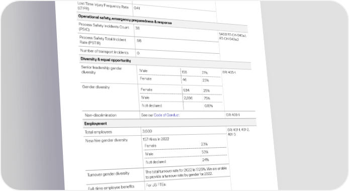 [1] People pillar disclosures Performance indicator FY22 Framework Workforce health & safety Total Recordable Incident Rate 1.21 SASB RT-CH-320a.1, (TRIR) RT-CH-320a.2 Total Recordable Fatality Rate 0 (TRFR) Lost Time Injury Frequency Rate 0.41 (LTIFR) Operational safety, emergency preparedness & response Process Safety Incidents Count 38 SASB RT-CH-540a.1, (PSIC) RT-CH-540a.2 Process Safety Total Incident .98 Rate (PSTIR) Number of transport incidents 0 Diversity & equal opportunity Senior leadership gender GRI 4051 Male 158 77% diversity Female 46 23% Gender diversity Female 934 25% Male 2,866 75% Not declared 0.15% Non-discrimination See our Code of Conduct GRI 4061 Employment Total employees 3,600 GRI 4011, 4012, 4013 New hire gender diversity 157 Hires in 2022 Female 23% Male 53% Not declared 24% Turnover gender diversity The total turnover rate for 2022 is 17.25%. We are unable to provide a turnover rate by gender for 2022. Full-time employee beneļ¬ts For US FTEs: Medical Dental Vision
