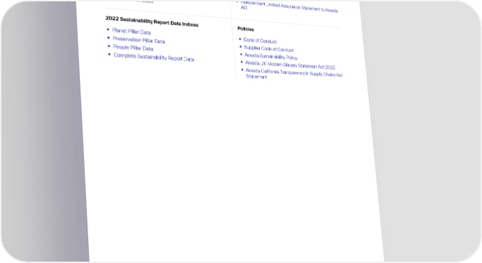 Resources & downloads 2022 Sustainability Report Assurance of Environmental Data 2022 Sustainability Report (PDF) Independent Limited Assurance Statement to Arxada AG Arxada Certiļ¬cates 2022 Sustainability Report Data Indices Policies Planet Pillar Data Code of Conduct Preservation Pillar Data Supplier Code of Conduct People Pillar Data Arxada Sustainability Policy Complete Sustainability Report Data Arxada UK Modern Slavery Statement Act 2022 Arxada California Transparency in Supply Chains Act Statement