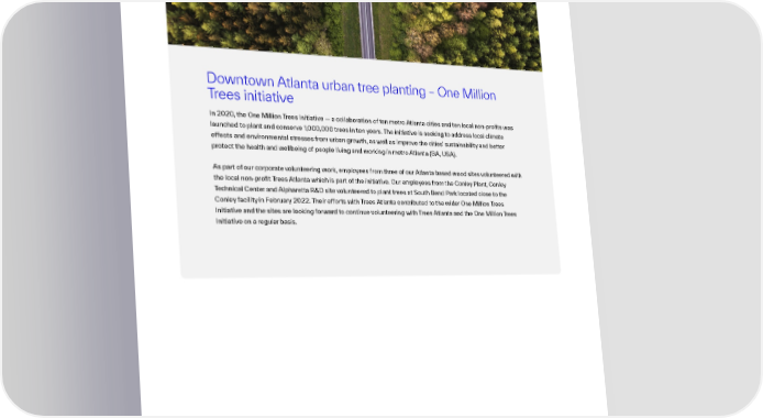HIGHLIGHT Downtown Atlanta urban tree planting – One Million Trees initiative In 2020, the One Million Trees Initiative — a collaboration of ten metro Atlanta cities and ten local non-profits was launched to plant and conserve 1,000,000 trees in ten years. The initiative is seeking to address local climate eects and environmental stresses from urban growth, as well as improve the cities’ sustainability and beer protect the health and wellbeing of people living and working in metro Atlanta (GA, USA). As part of our corporate volunteering work, employees from three of our Atlanta based wood sites volunteered with the local non-profit Trees Atlanta which is part of the initiative. Our employees from the Conley Plant, Conley Technical Center and Alpharea R&D site volunteered to plant trees at South Bend Park located close to the Conley facility in February 2022. Their eorts with Trees Atlanta contributed to the wider One Million Trees Initiative and the sites are looking forward to continue volunteering with Trees Atlanta and the One Million Trees Initiative on a regular basis.