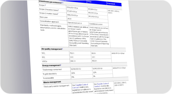 Performance indicator FY22 Framework Approach to stakeholder See Our business & sustainability and Advocacy GRI 229 engagement leadership for science-based decision-making for a sustainable future Planet pillar disclosures Performance indicator FY21 FY22 Framework [1] [2] Greenhouse gas emissions Scope 1* 658,222 tCOe 181,138 tCO e GRI 3051, 3052, 2 2 3055 Scope 2 location-based* 173,871 tCO e 155,514 tCO e 2 2 Scope 2 market-based* 168,216 tCO e 163,052 tCOe 2 2 Base year 2021 Consolidation approach Operational control Operational control Standards, methodologies, GHG Emissions are defined GHG Emissions are defined assumptions, and/or calculation as Scope 1 and 2 as Scope 1 and 2 tools greenhouse gas emissions greenhouse gas emissions of the Group, determined in of the Group, determined in accordance with the Scope accordance with the Scope 1 and 2 guidance of the 1 and 2 guidance of the GHG Protocol Corporate GHG Protocol Corporate Accounting and Reporting Accounting and Reporting Standard. Standard. [1] Air quality management NO 75.0 t 68.6 t SASB RT-CH-120a.1 X SO 3.8 t 3.8 t X VOCs 166.3 t 168.8 t [1] Energy management Total energy consumed 5,616,650 GJ 5,043,030 GJ SASB RT-CH-130a.1 % grid electricity 30% 32% % renewable 5% 1% Waste management Third-party waste management See Supplier Code of See Supplier Code of GRI 3062, 3063, Conduct. Additionally, Conduct. Additionally, 3064, 3065 legislative compliance is legislative compliance is administrated locally based administrated locally based on local legislation. on local legislation.