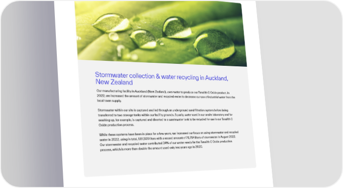 Looking forward to 2023 In 2023, we will set water reduction targets companywide and will work closely with our manufacturing sites to preserve this important and critical resource. HIGHLIGHT Stormwater collection & water recycling in Auckland, New Zealand Our manufacturing facility in Auckland (New Zealand), uses water to produce our Tanalith C Oxide product. In 2022, we increased the amount of stormwater and recycled water to decrease our use of industrial water from the local town supply. Stormwater within our site is captured and led through an underground sand filtration system before being transferred to two storage tanks within our facility grounds. Equally, water used in our onsite laboratory and for washing up, for example, is captured and diverted to a wastewater tank to be recycled for use in our Tanalith C Oxide production process. While these systems have been in place for a few years, we increased our focus on using stormwater and recycled water in 2022, using in total, 581,509 liters with a record amount of 79,764 liters of stormwater in August 2022. Our stormwater and recycled water contributed 34% of our water needs for the Tanalith C Oxide production process, which is more than double the amount used only two years ago in 2020.