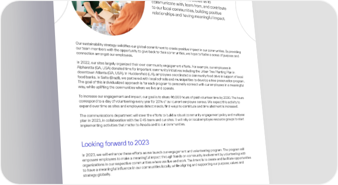 Community involvement Engaging with the communities around the sites where we operate allows us to communicate with, learn from, and contribute to our local communities, building positive relationships and having meaningful impact. Our sustainability strategy solidifies our global commitment to create positive impact in our communities. By providing our team members with the opportunity to give back to their communities, we hope to foster a sense of purpose and connection amongst our employees. In 2022, our sites largely organized their own community engagement eorts. For example, our employees in Alpharea (GA, USA) donated time for important community initiatives including the Urban Tree Planting Plan in downtown Atlanta (GA, USA). In Huddersfield (UK), employees coordinated a community food drive in support of local food banks. In Salto (Brazil), we partnered with local schools and municipalities to develop a tree preservation program. The goal of this individualized approach is for each program to personally connect with our employees in a meaningful way, while upliing the communities where we live and operate. To increase our engagement and impact, our goal is to share 46,000 hours of paid volunteer time by 2030. The hours correspond to a day of volunteering every year for 20% of our current employee census. We expect this activity to expand over time as sites and employees detect needs, find ways to contribute and time allotment is increased. The communications department will steer the eorts to build a robust community engagement policy and multiyear plan in 2023, in collaboration with the EHS team and our sites. It will rely on local employee resource groups to start implementing activities that maer to Arxada and to our communities. Looking forward to 2023 In 2023, we will enhance these eorts as we launch our engagement and volunteering program. The program will empower employees to make a meaningful impact through hands on community involvement by volunteering with organizations in our respective communities where we live and work. The intent is to create and facilitate opportunities to have a meaningful influence in our communities locally, while aligning and supporting our purpose, values and strategy globally.