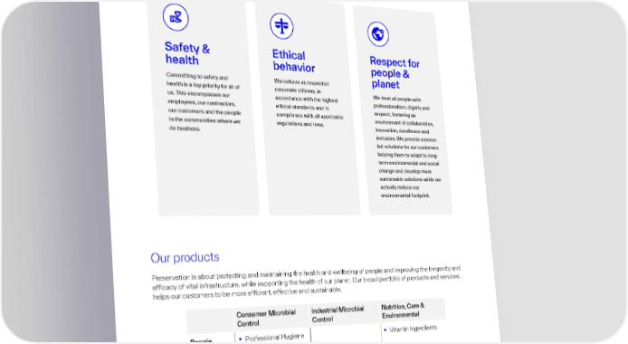 Our purpose centers around the importance of preservation for society and the environment. Preservation can protect and maintain the health and wellbeing of people, improve the longevity and ecacy of vital infrastructure, while supporting the health of our planet. To help us achieve our purpose, we follow a set of core values that reflect the longstanding commitments of our heritage companies, demonstrate our steadfast commitment to our people and the planet, and exemplify the way we work. These values are timeless and form the foundation of everything we do. Safety & Ethical Respect for health behavior people & planet Commiing to safety and We behave as respected health is a top priority for all of corporate citizens, in We treat all people with us. This encompasses our accordance with the highest professionalism, dignity and employees, our contractors, ethical standards and in respect, fostering an our customers and the people compliance with all applicable environment of collaboration, in the communities where we regulations and laws. innovation, excellence and do business. inclusion. We provide science- led solutions for our customers helping them to adapt to long- term environmental and social change and develop more sustainable solutions while we actively reduce our environmental footprint. Our products Preservation is about protecting and maintaining the health and wellbeing of people and improving the longevity and ecacy of vital infrastructure, while supporting the health of our planet. Our broad porolio of products and services helps our customers to be more ecient, eective and sustainable. Consumer Microbial Industrial Microbial Nutrition, Care & Control Control Environmental Professional Hygiene Vitamin Ingredients People Home & Personal Care Wood Protection Paints & Coating Composite Materials Infrastructure Material Protection