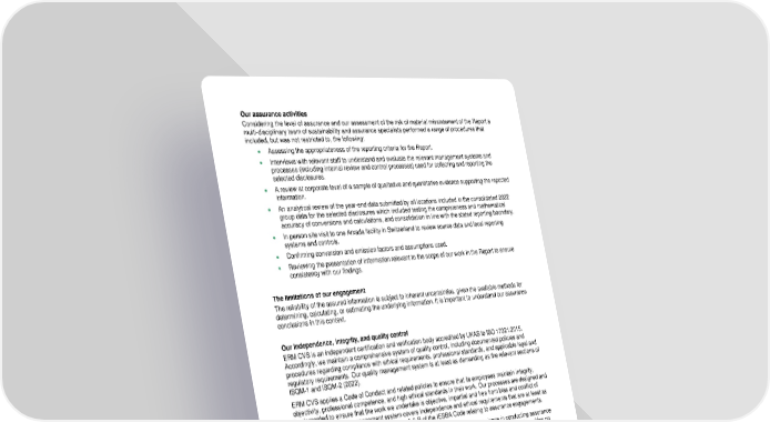 Our assurance activities Considering the level of assurance and our assessment of the risk of material misstatement of the Report a multi-disciplinary team of sustainability and assurance specialists performed a range of procedures that included, but was not restricted to, the following: • Assessing the appropriateness of the reporting criteria for the Report. • Interviews with relevant staff to understand and evaluate the relevant management systems and processes (including internal review and control processes) used for collecting and reporting the selected disclosures. • A review at corporate level of a sample of qualitative and quantitative evidence supporting the reported information. • An analytical review of the year-end data submitted by all locations included in the consolidated 2022 group data for the selected disclosures which included testing the completeness and mathematical accuracy of conversions and calculations, and consolidation in line with the stated reporting boundary. • In person site visit to one Arxada facility in Switzerland to review source data and local reporting systems and controls. • Confirming conversion and emission factors and assumptions used. • Reviewing the presentation of information relevant to the scope of our work in the Report to ensure consistency with our findings. The limitations of our engagement The reliability of the assured information is subject to inherent uncertainties, given the available methods for determining, calculating, or estimating the underlying information. It is important to understand our assurance conclusions in this context. Our independence, integrity, and quality control ERM CVS is an independent certification and verification body accredited by UKAS to ISO 17021:2015. Accordingly, we maintain a comprehensive system of quality control, including documented policies and procedures regarding compliance with ethical requirements, professional standards, and applicable legal and regulatory requirements. Our quality management system is at least as demanding as the relevant sections of ISQM-1 and ISQM-2 (2022). ERM CVS applies a Code of Conduct and related policies to ensure that its employees maintain integrity, objectivity, professional competence, and high ethical standards in their work. Our processes are designed and implemented to ensure that the work we undertake is objective, impartial and free from bias and conflict of interest. Our certified management system covers independence and ethical requirements that are at least as demanding as the relevant sections of Parts A & B of the IESBA Code relating to assurance engagements. The team that has undertaken this assurance engagement has extensive experience in conducting assurance on environmental, social, ethical and health and safety information, systems and processes, and provides no consultancy related services to Arxada in any respect. Gareth Manning Partner London UK th May 15 , 2023 ERM Certification and Verification Services Limited www.ermcvs.com | [email protected]
