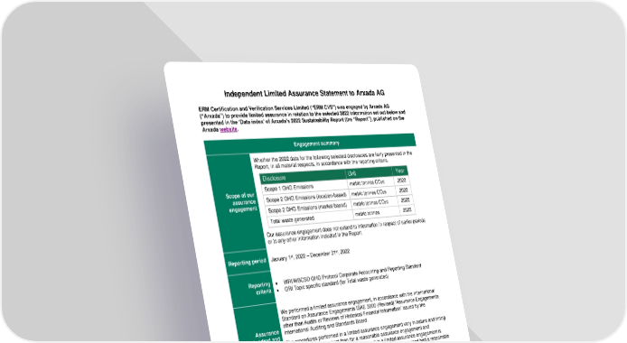 Independent Limited Assurance Statement to Arxada AG ERM Certification and Verification Services Limited (“ERM CVS”) was engaged by Arxada AG (“Arxada”) to provide limited assurance in relation to the selected 2022 information set out below and presented in the ‘Data index’ of Arxada’s 2022 Sustainability Report (the “Report”), published on the Arxada website. Engagement summary Whether the 2022 data for the following selected disclosures are fairly presented in the Report, in all material respects, in accordance with the reporting criteria. Disclosure Unit Year Scope 1 GHG Emissions metric tonnes CO e 2022 Scope of our 2 Scope 2 GHG Emissions (location-based) metric tonnes CO e 2022 assurance 2 engagement Scope 2 GHG Emissions (market-based) metric tonnes CO e 2022 2 Total waste generated metric tonnes 2022 Our assurance engagement does not extend to information in respect of earlier periods or to any other information included in the Report. st st Reporting period January 1 , 2022 – December 31 , 2022 Reporting • WRI/WBCSD GHG Protocol Corporate Accounting and Reporting Standard criteria • GRI Topic specific standard (for Total waste generated) We performed a limited assurance engagement, in accordance with the International Standard on Assurance Engagements ISAE 3000 (Revised) ‘Assurance Engagements Assurance other than Audits or Reviews of Historical Financial Information’ issued by the standard and International Auditing and Standards Board. level of The procedures performed in a limited assurance engagement vary in nature and timing assurance from and are less in extent than for a reasonable assurance engagement and consequently, the level of assurance obtained in a limited assurance engagement is substantially lower than the assurance that would have been obtained had a reasonable assurance engagement been performed. Arxada is responsible for preparing the Report and for the collection and presentation of the information within it, and for the designing, implementing, and maintaining of internal Respective controls relevant to the preparation and presentation of the Report. responsibilities ERM CVS’ responsibility is to provide conclusions to Arxada on the agreed scope based on our engagement terms with Arxada, the assurance activities performed and exercising our professional judgement. We accept no responsibility, and deny any liability, to any party other than Arxada for the conclusions we have reached. Our conclusion Based on our activities, as described below, nothing has come to our attention to indicate that the 2022 data and information for the disclosures listed under ‘Scope’ above are not fairly presented in the Report, in all material respects, in accordance with the reporting criteria.