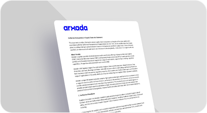 This statement provides information about supply chain transparency at Arxada and has been published in accordance with the California Transparency in Supply Chains Act (the “Act”).