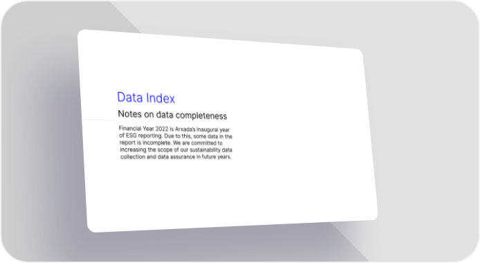 Data Index Notes on data completeness Financial Year 2022 is Arxada’s inaugural year of ESG reporting. Due to this, some data in the report is incomplete. We are committed to increasing the scope of our sustainability data collection and data assurance in future years.
