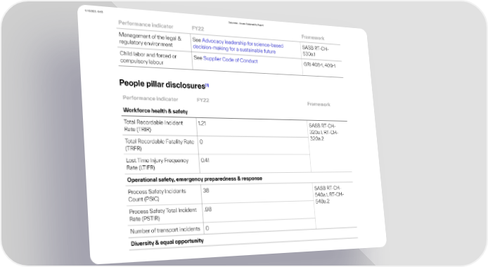11/10/2023, 10:53 Data index - Arxada Sustainability Report Performance indicator FY22 Framework Management of the legal & See Advocacy leadership for science-based SASB RT-CH- regulatory environment decision-making for a sustainable future 530a.1 Child labor and forced or See Supplier Code of Conduct GRI 4081, 4091 compulsory labour [1] People pillar disclosures Performance indicator FY22 Framework Workforce health & safety Total Recordable Incident 1.21 SASB RT-CH- Rate (TRIR) 320a.1, RT-CH- 320a.2 Total Recordable Fatality Rate 0 (TRFR) Lost Time Injury Frequency 0.41 Rate (LTIFR) Operational safety, emergency preparedness & response Process Safety Incidents 38 SASB RT-CH- Count (PSIC) 540a.1, RT-CH- 540a.2 Process Safety Total Incident .98 Rate (PSTIR) Number of transport incidents 0 Diversity & equal opportunity