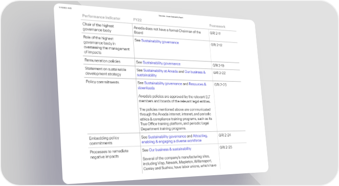 11/10/2023, 10:53 Data index - Arxada Sustainability Report Performance indicator FY22 Framework Chair of the highest Arxada does not have a formal Chairman of the GRI 211 governance body Board Role of the highest See Sustainability governance GRI 212 governance body in overseeing the management of impacts Remuneration policies See Sustainability governance GRI 219 Statement on sustainable See Sustainability at Arxada and Our business & GRI 222 development strategy sustainability Policy commitments See Sustainability governance and Resources & GRI 223 downloads Arxada’s policies are approved by the relevant ELT members and boards of the relevant legal entities. The policies mentioned above are communicated through the Arxada internet, intranet, and periodic ethics & compliance training programs, such as its True Oce training plaorm, and periodic Legal Department training programs. Embedding policy See Sustainability governance and Aracting, GRI 224 commitments enabling & engaging a diverse workforce Processes to remediate See Our business & sustainability GRI 225 negative impacts Several of the company’s manufacturing sites, including Visp, Newark, Mapleton, Willamsport, Conley and Suzhou, have labor unions, which have