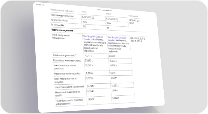 11/10/2023, 10:53 Data index - Arxada Sustainability Report Performance indicator FY21 FY22 Framework Total energy consumed 5,616,650 GJ 5,043,030 GJ SASB RT-CH- 130a.1 % grid electricity 30% 32% % renewable 5% 1% Waste management Third-party waste See Supplier Code of See Supplier Code of GRI 3062, 3063, management Conduct. Additionally, Conduct. Additionally, 3064, 3065 legislative compliance is legislative compliance is administrated locally administrated locally based on local based on local legislation. legislation. Total waste generated* 70,717 t 53,881 t Hazardous waste generated 57,670 t 41,203 t Non-hazardous waste 13,047 t 12,678 t generated Hazardous waste recycled 6,899 t 5,109 t Non-hazardous waste 2,522 t 2,585 t recycled Hazardous waste incinerated 34,671 t 31,583 t Hazardous waste sent to 3,034 t 1,240 t landfill Hazardous waste disposed 13,064 t 3,269 t (other options)